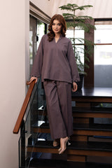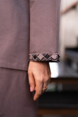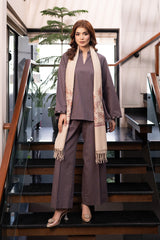 Orren is a stylish winter co-ord set in a warm brown shade, crafted from premium karandi fabric. Featuring embroidery on the neckline and sleeves, it pairs beautifully with an embroidered cashmere shawl for added elegance.