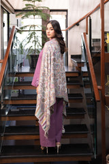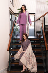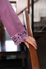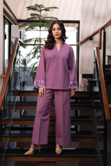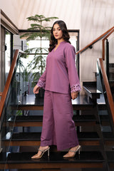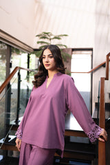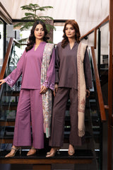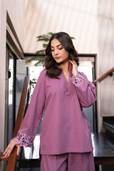 Orren Charm is a chic winter co-ord set in a soft pink shade, crafted from premium karandi fabric. Featuring embroidered cutwork on the sleeves, it pairs with an embroidered cashmere shawl for a complete elegant look.
