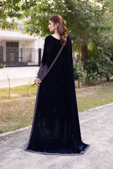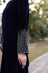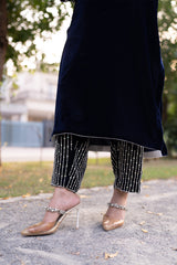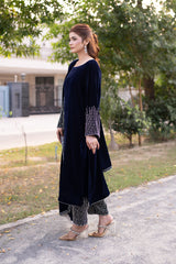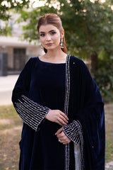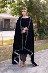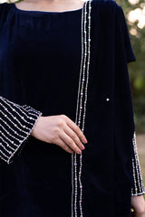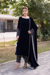 A premium three-piece velvet suit in an elegant navy blue shade. Crafted from luxurious macro velvet, this outfit combines classic design with intricate detailing, making it a statement ensemble for any special occasion.