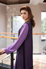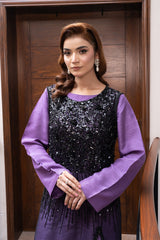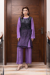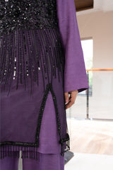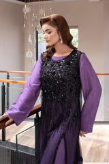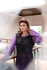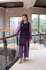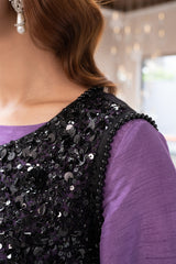 Édlet Noir is a bold three-piece ensemble in black and purple, combining raw silk trousers and inner with a black net upper. Enhanced with intricate marble stone handwork, this design strikes the perfect balance between modern sophistication and timeless glamour.