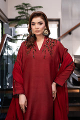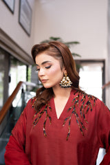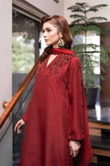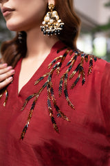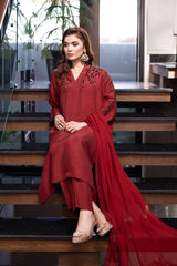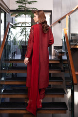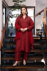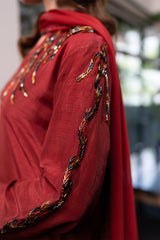 Silkenna is a graceful three-piece raw silk suit in a deep maroon shade, paired with a chiffon dupatta. Adorned with multi-stone work on the shoulders and arms, and finished with a stone lace dupatta, it blends elegance with subtle sparkle.